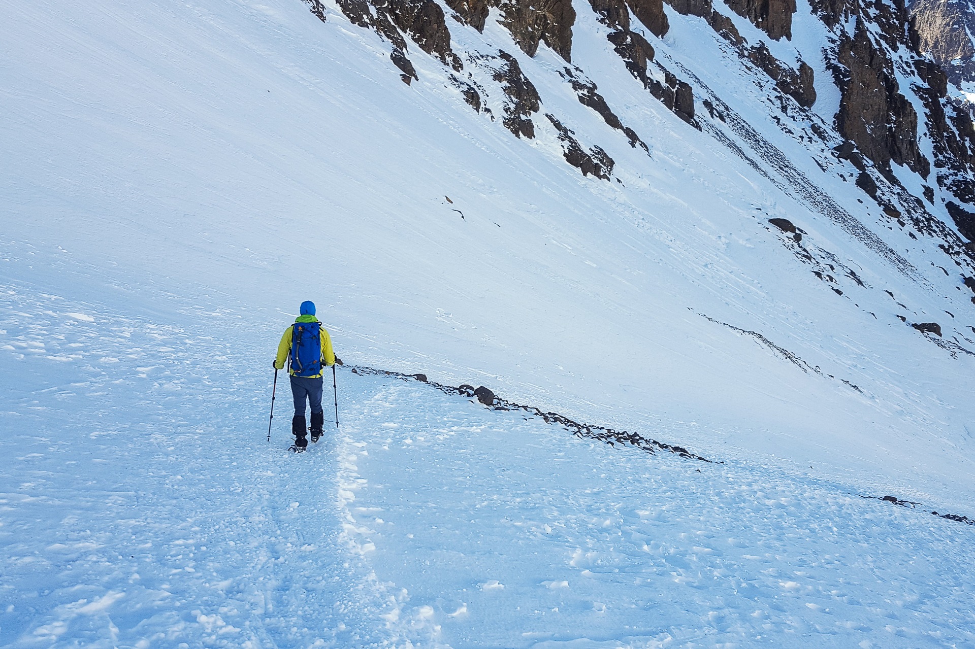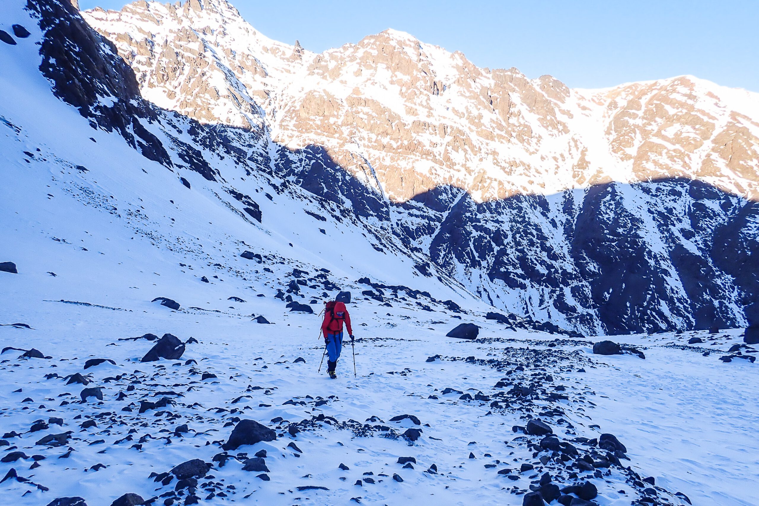 Od samego początku jest stromo. Na szczęście śnieg jest zmrożony. Nasza droga prowadzi wznoszącym się trawersem w lewo. Omija tym samym podstawę ściany Punta lmlil (3560 m n.p.m.). Po około godzinnym trawersie skręcamy, by wejść w drugi wnoszący się trawers – tym razem w prawo pod skałami szczytu Tibheirine (3887 m n.p.m.).