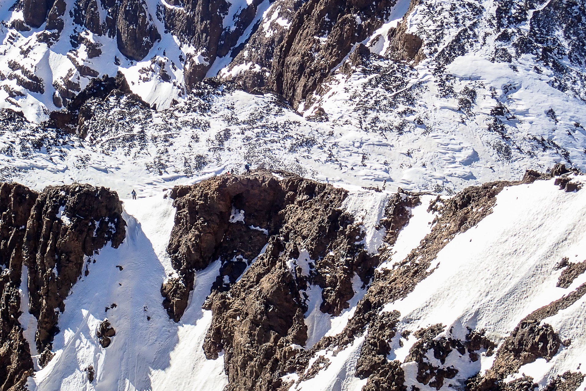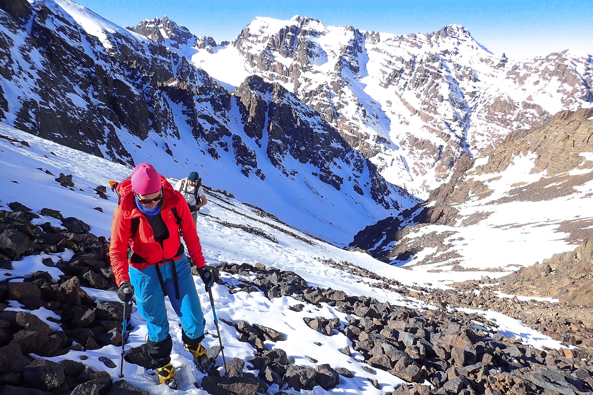 Z rozmów w schronisku pamiętaliśmy, aby obejść podstawę tych skał po lewej stronie. Tak też robimy. Znów robi się stromo, więc kijki i czekan są przydatne. Pod ciemnymi skałami skręcamy w lewo i mikstowym śnieżno-skalno-lodowym terenem docieramy do pól śnieżnych. W końcu dotarło do nas słońce i od razu zrobiło się gorąco. Słońce sprawiło, że śnieg zrobił się miękki i grząski, a w takim trudniej się poruszać. Na szczęście do przełęczy nie jest daleko. Po 20 minutach stajemy na niej i w końcu możemy podziwiać widoki na szczyty Atlasu po drugiej stronie.