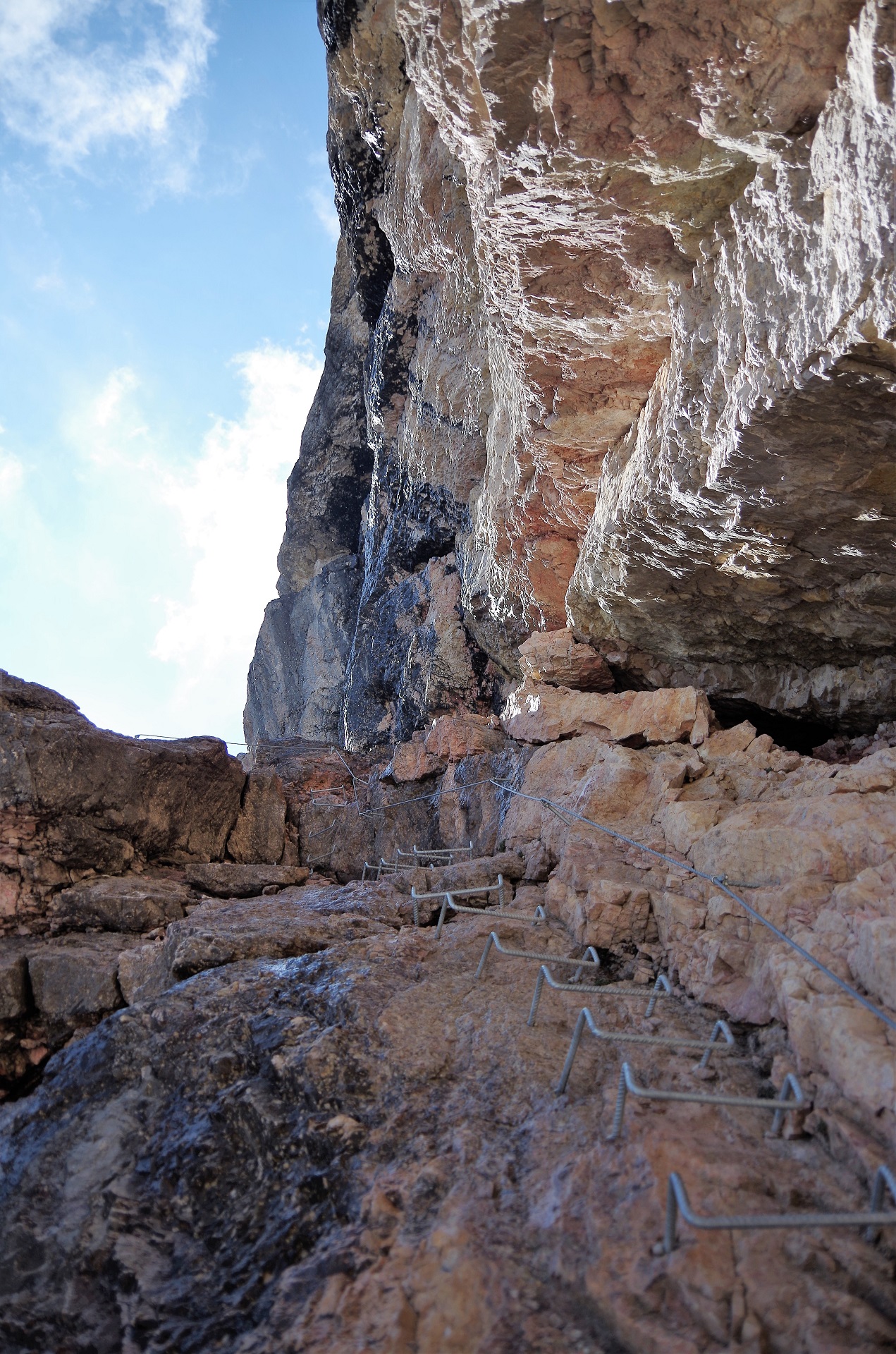 Mijamy przełęcz i wychodzimy wyżej po wbitych w skałę stopniach. Kilka metrów w górę i po chwili nieubezpieczoną ścieżką podchodzimy pod właściwą cześć ferraty. O 12:30 wchodzimy w Zachodnią Grań Marmolady (Westgrat Klettersteig), znaną jako Hans-Seyffert-Weg lub Via Ferrata della Marmolada.