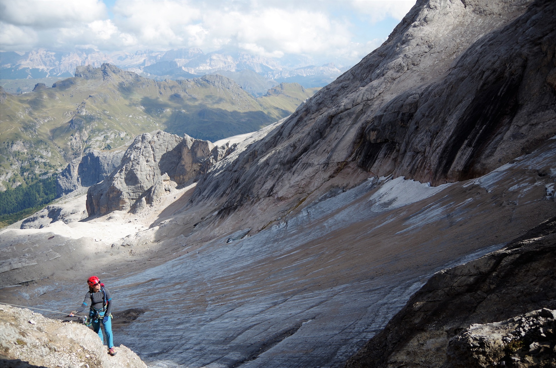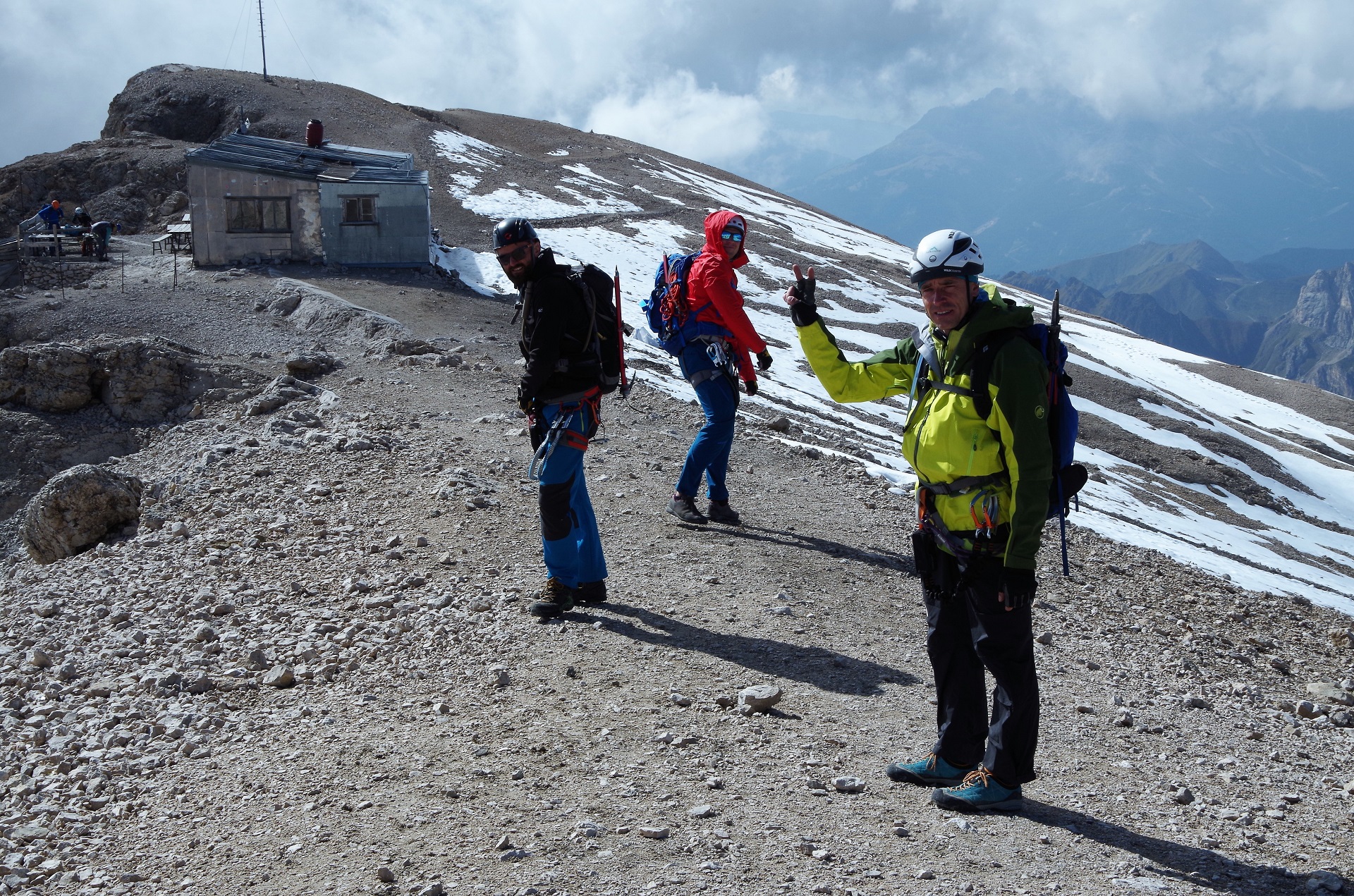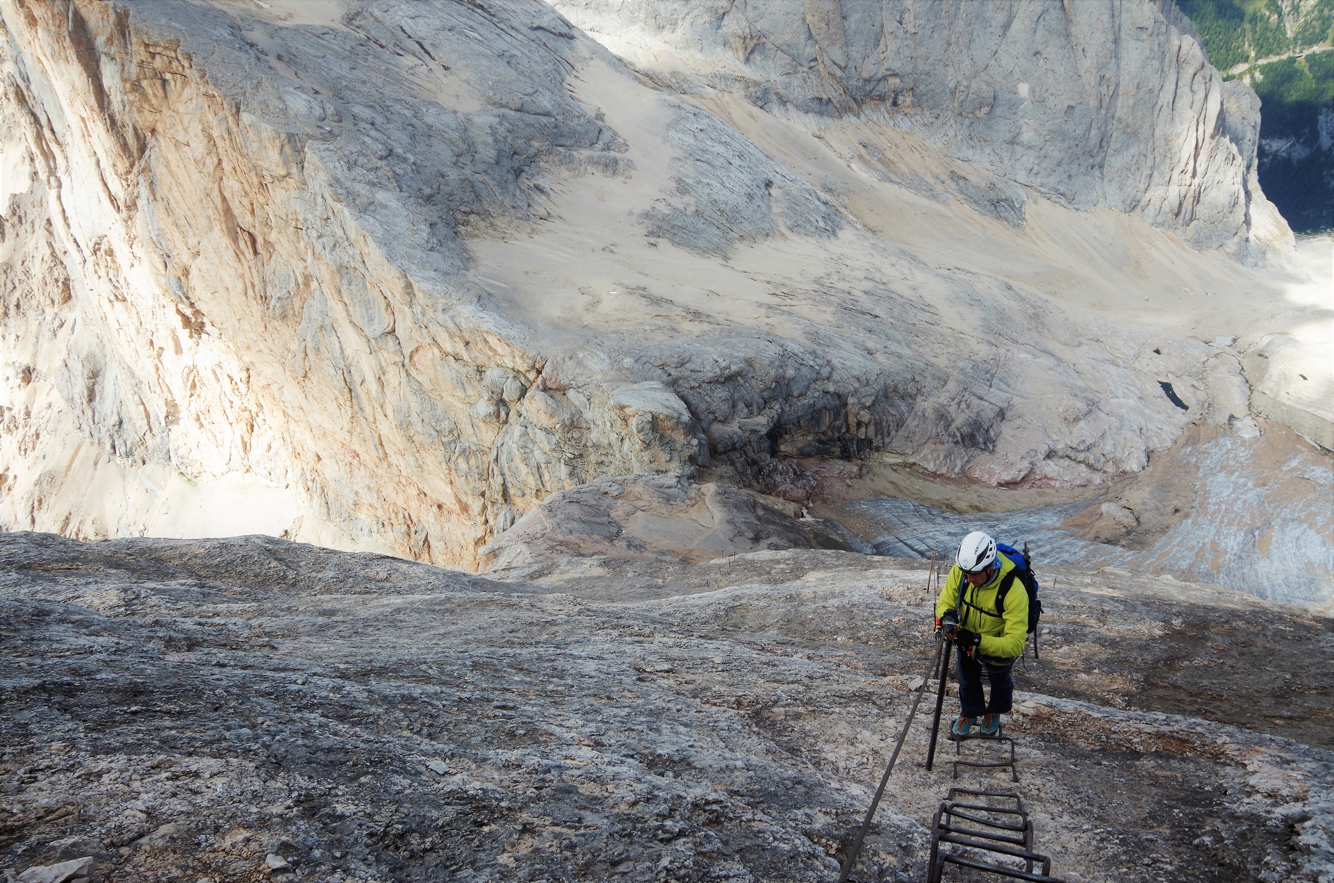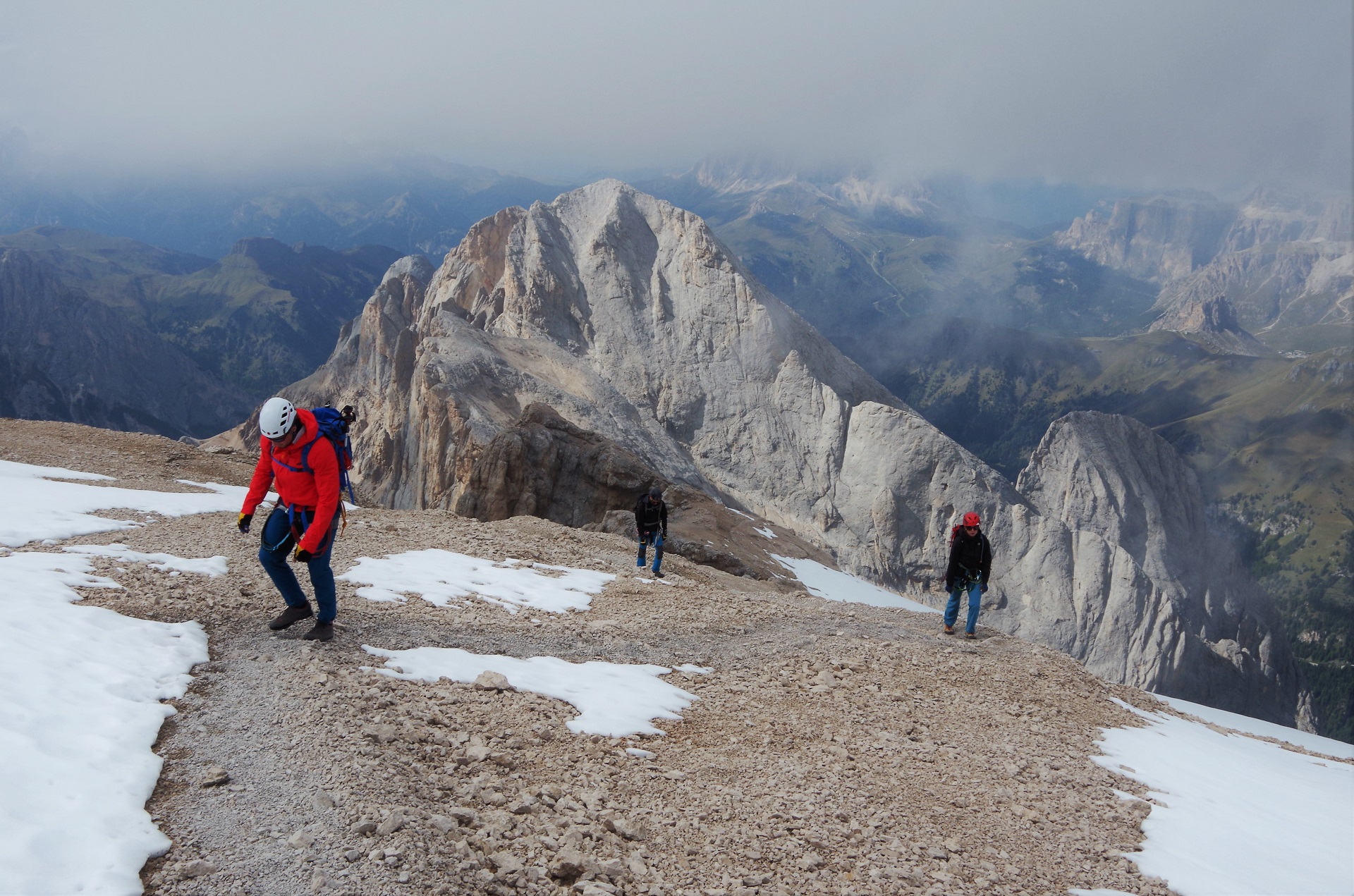 UWAGA! Są różne drogi na szczyt Punta Penia. Można podejść do feraty Granią zachodnią również od strony Północnej. Sam szczyt można zdobyć również drogą „Normalną” – czyli tą, którą my schodziliśmy. Pamiętaj, aby zabrać ze sobą niezbędny sprzęt – to jest droga przez lodowiec. Wymagane jest posiadanie czekana, raków i liny- oraz umiejętność poruszania się po lodowcu!!!