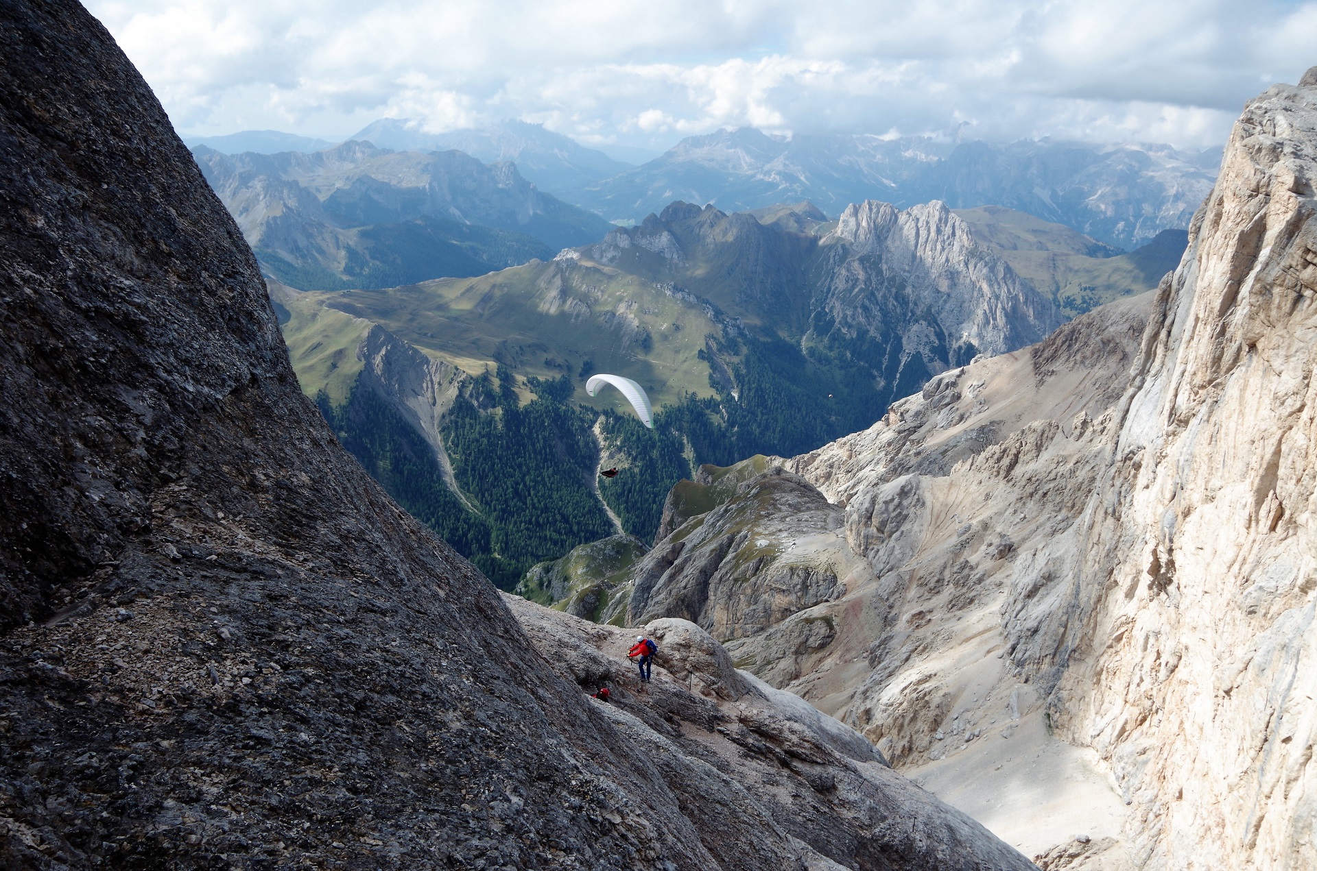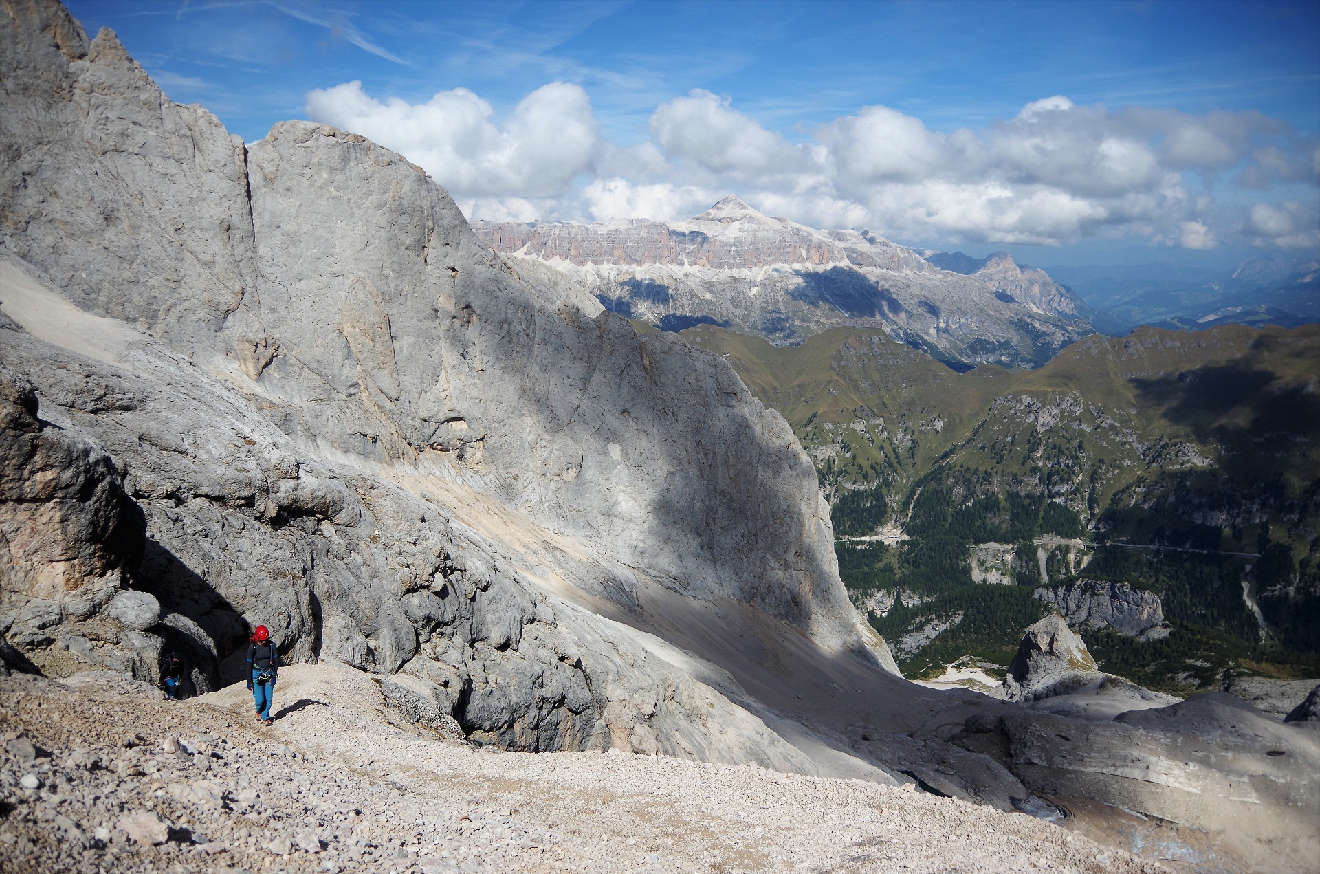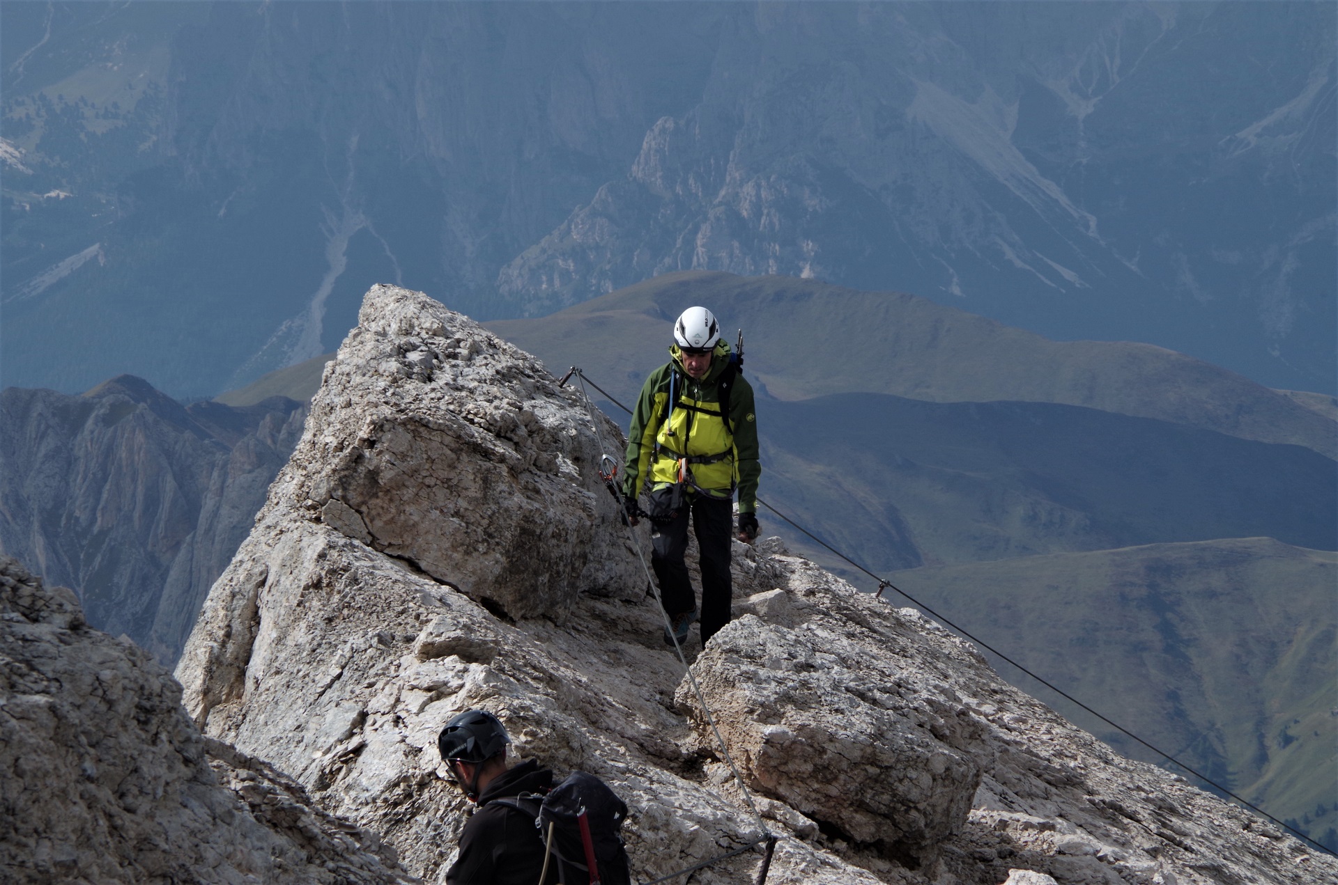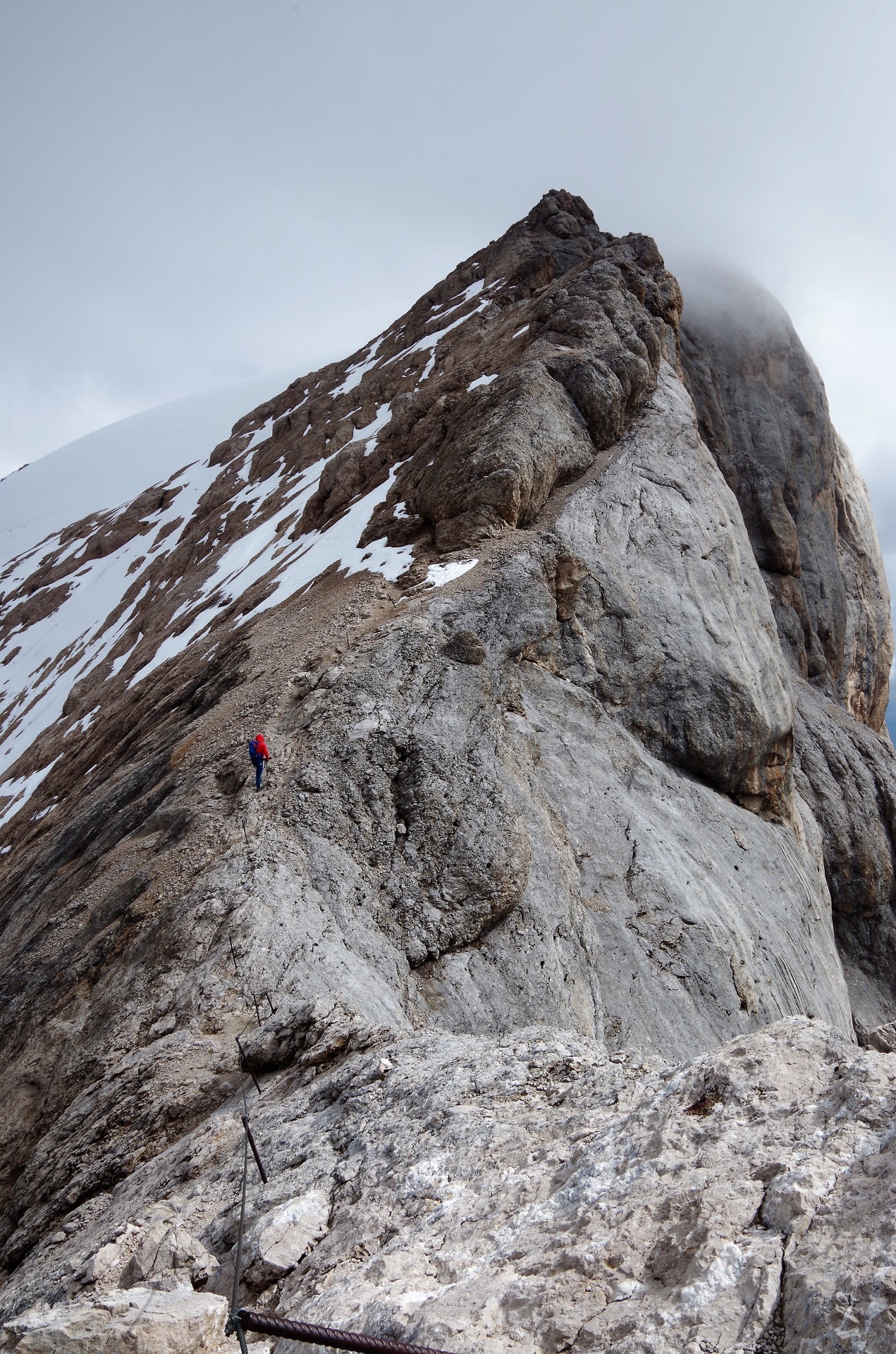 Nadchodzą ciemne chmury i robi się chłodniej, więc ubieramy kurtki i mkniemy dalej do góry. Później granią schodzimy lekko w dół. Przed nami kolejny kawałek wspaniałej grani, po której idziemy do góry, w kierunku szczytu. Widoki są olśniewające. Widać grzebień Marmolady, pobliskie szczyty. Co prawda chmury nieco ograniczają widoczność, ale i tak zachwycamy się drogą i krajobrazem.