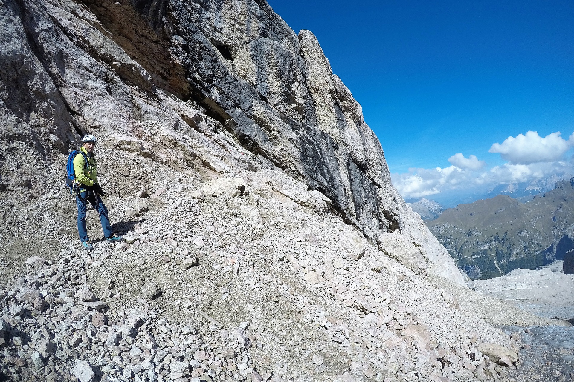 Nie zauważamy namalowanego na skale znaku i wychodzimy nieco wyżej, by zrobić trawers w prawo, do początku ferraty. Nie widać żadnych znaków ani charakterystycznych czerwonych kropek. Kluczymy między skałami polodowcowymi. Obok nas idzie Włoch, który sugeruje, że jesteśmy na dobrej drodze, ale on ostatni raz był tu 15 lat temu, kiedy było pełno śniegu. Myślę o tym, jak bardzo niszczymy naszą planetę, że topią się śniegi a po lodowcu zostają tylko skały…