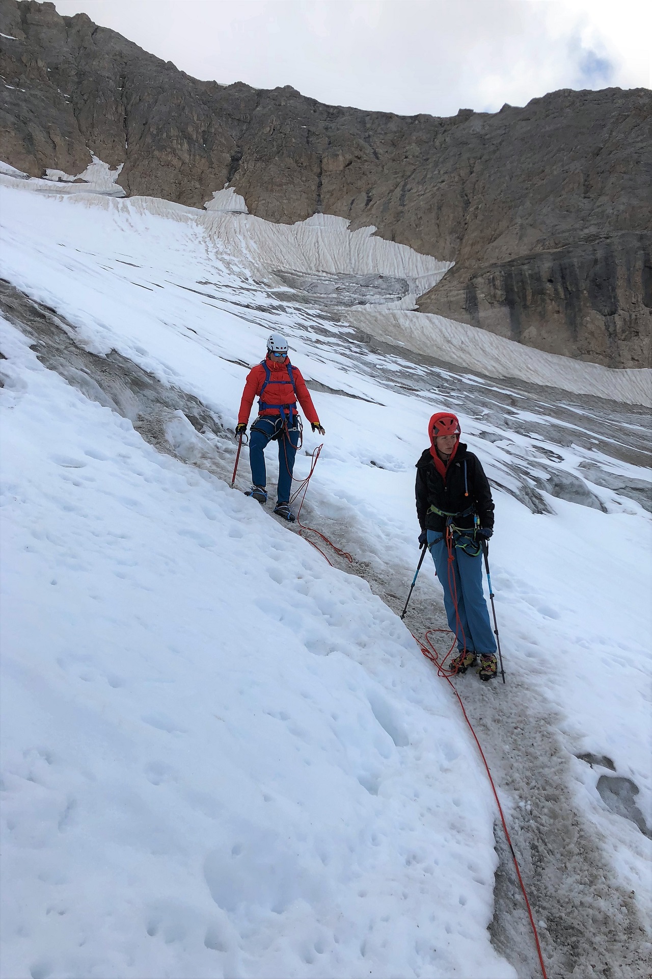 Opcja wejścia, którą wybraliśmy to najbardziej urozmaicona wersja zdobycia Punta Penii. Są również inne warianty, które nie wymagają takiej wszechstronności i całego sprzętu. Jednak my chcieliśmy doświadczyć zimowych warunków i przejść się lodowcem. Zatem najwyższy szczyt Dolomitów za nami, pierwszy lodowiec za nami, teraz myślimy, co następne J