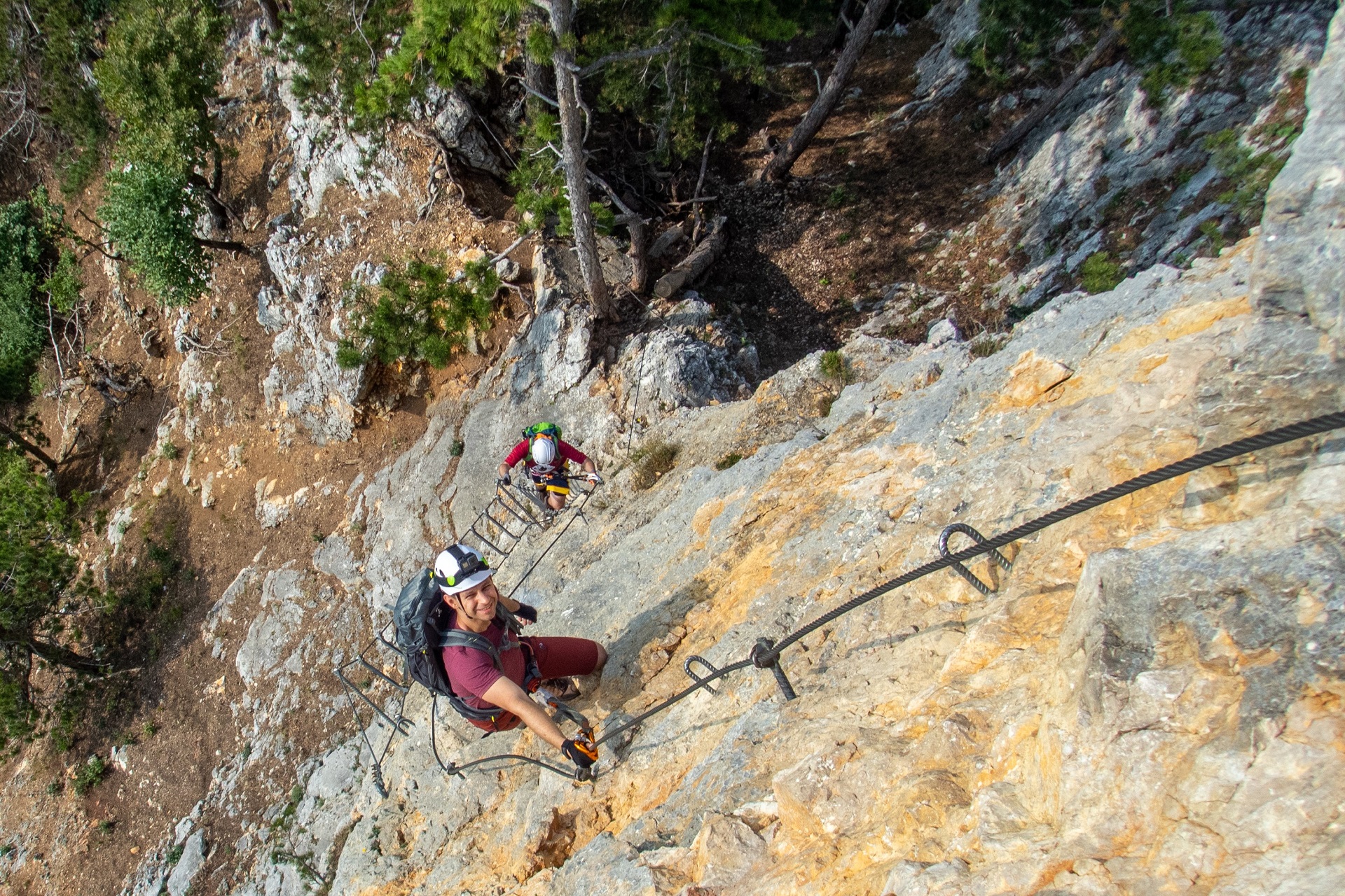 Chwilę później, po krótkim podejściu docieramy do największej atrakcji via ferraty — linowej drabinki. Stroma i ustawiona prostopadle do skały konstrukcja sprawia, że poruszając się po niej, czujemy się, jakbyśmy poruszali się w powietrzu.
