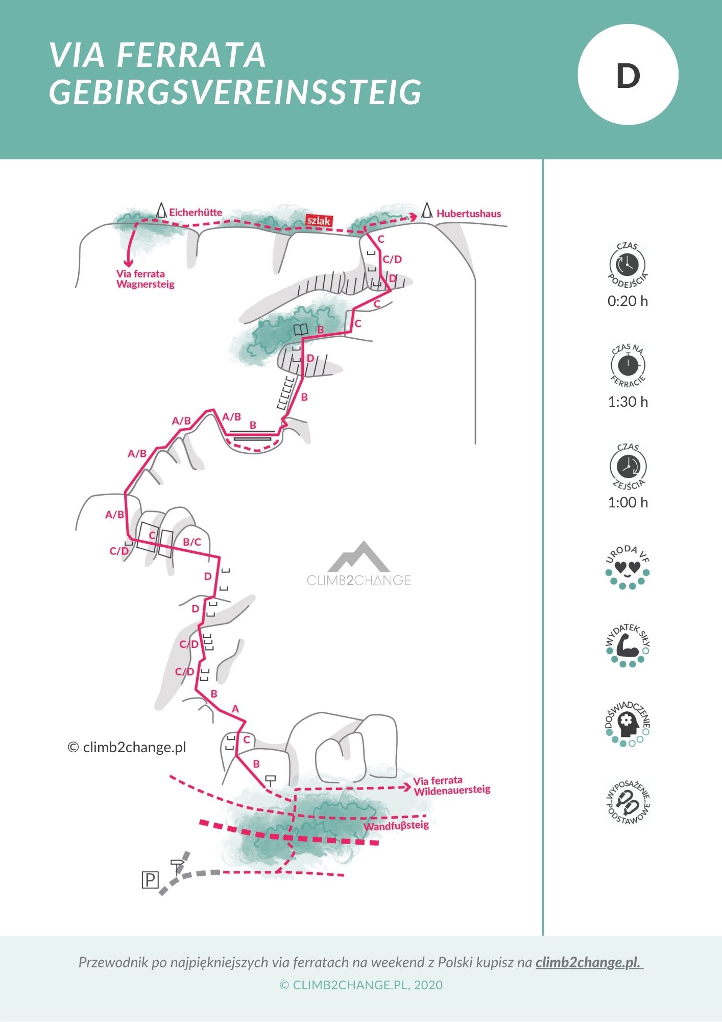 Via ferrata Gebirgsvereinssteig to trudny i wymagający szlak wyceniony za D. Niezbędne jest doświadczenie w mocno eksponowanym terenie. Umiejętność poruszania się zarówno po skalnych, gładkich płytach, jak i ścianach, które momentami są wręcz pionowe. Na szlaku znajduje się 10-metrowa stroma i ustawiona prostopadle do skały drabinka. Podczas jej pokonywania ma się wrażenie, że poruszamy się w powietrzu.