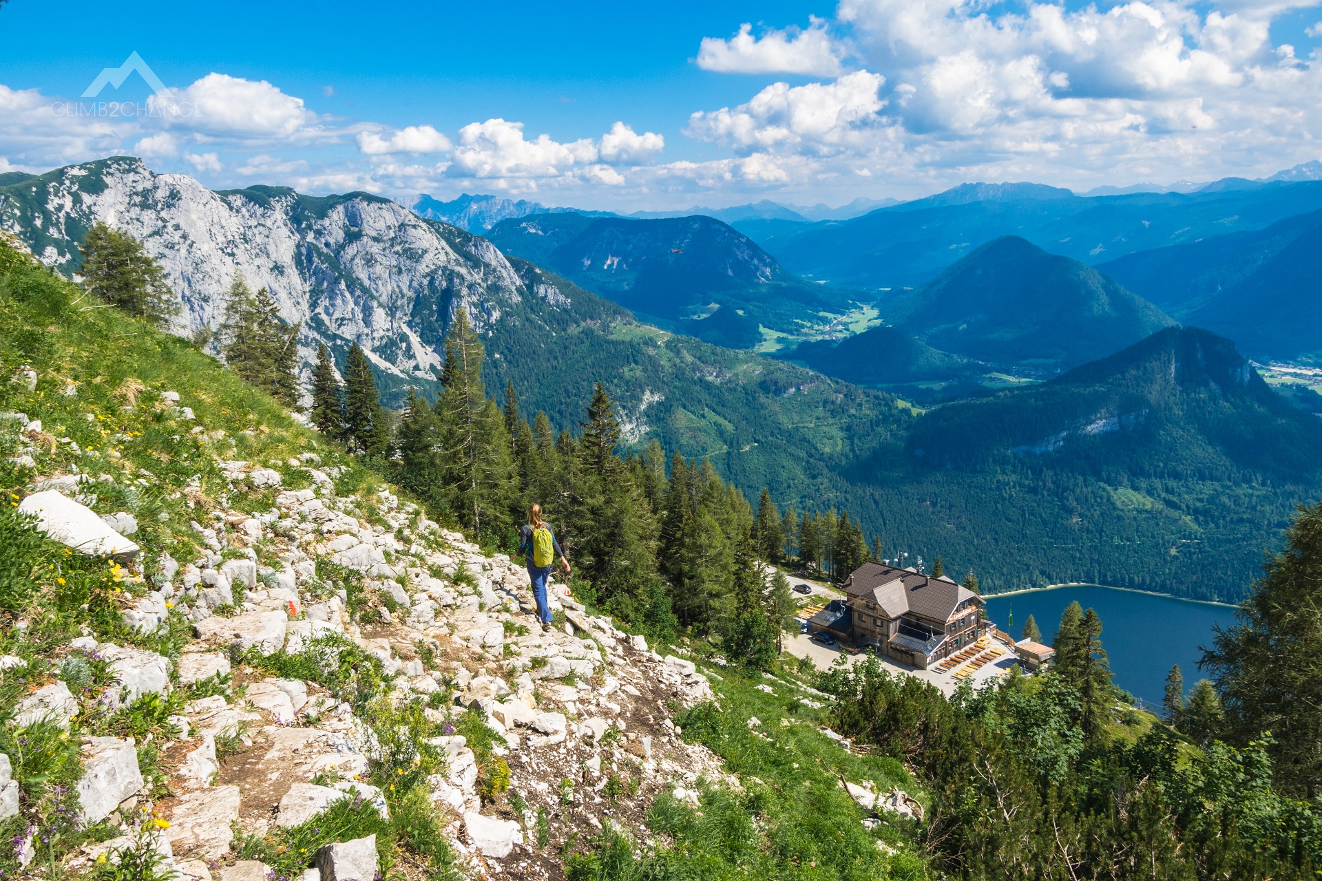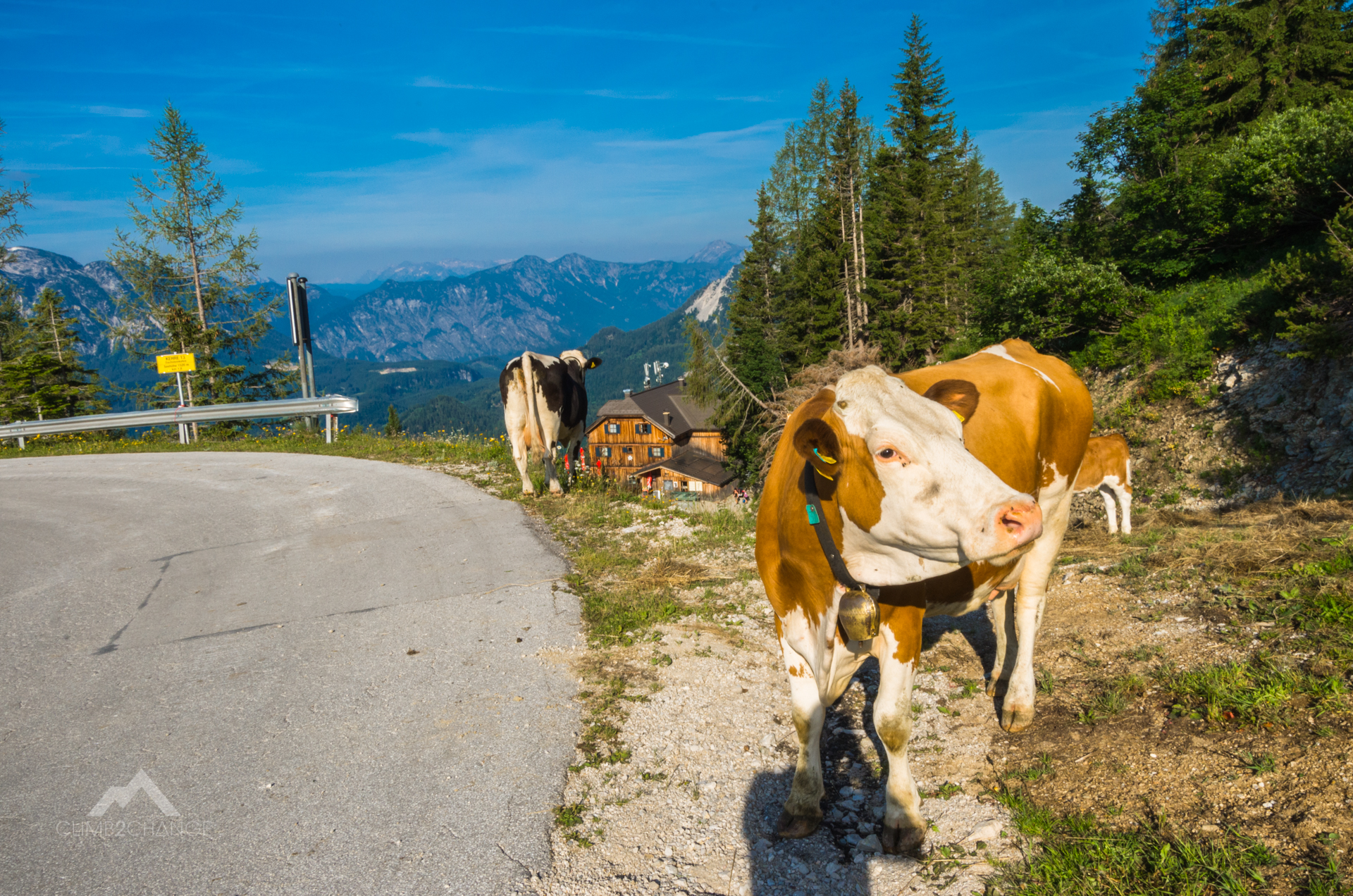 Przygodę z ferratą Sisi zaczynamy na parkingu przy zjeździe do schroniska Loserhutte. Dojeżdżamy tutaj płatną drogą – Panorama Strasse, z miejscowości Altaussee. Zabieramy plecaki ze sprzętem i schodzimy w dół w stronę schroniska. Stamtąd jeszcze niżej na pole, na którym wypasają się krowy. Mijamy kamienne zapory lawinowe i za znakami kierunkowymi skręcamy w prawo.