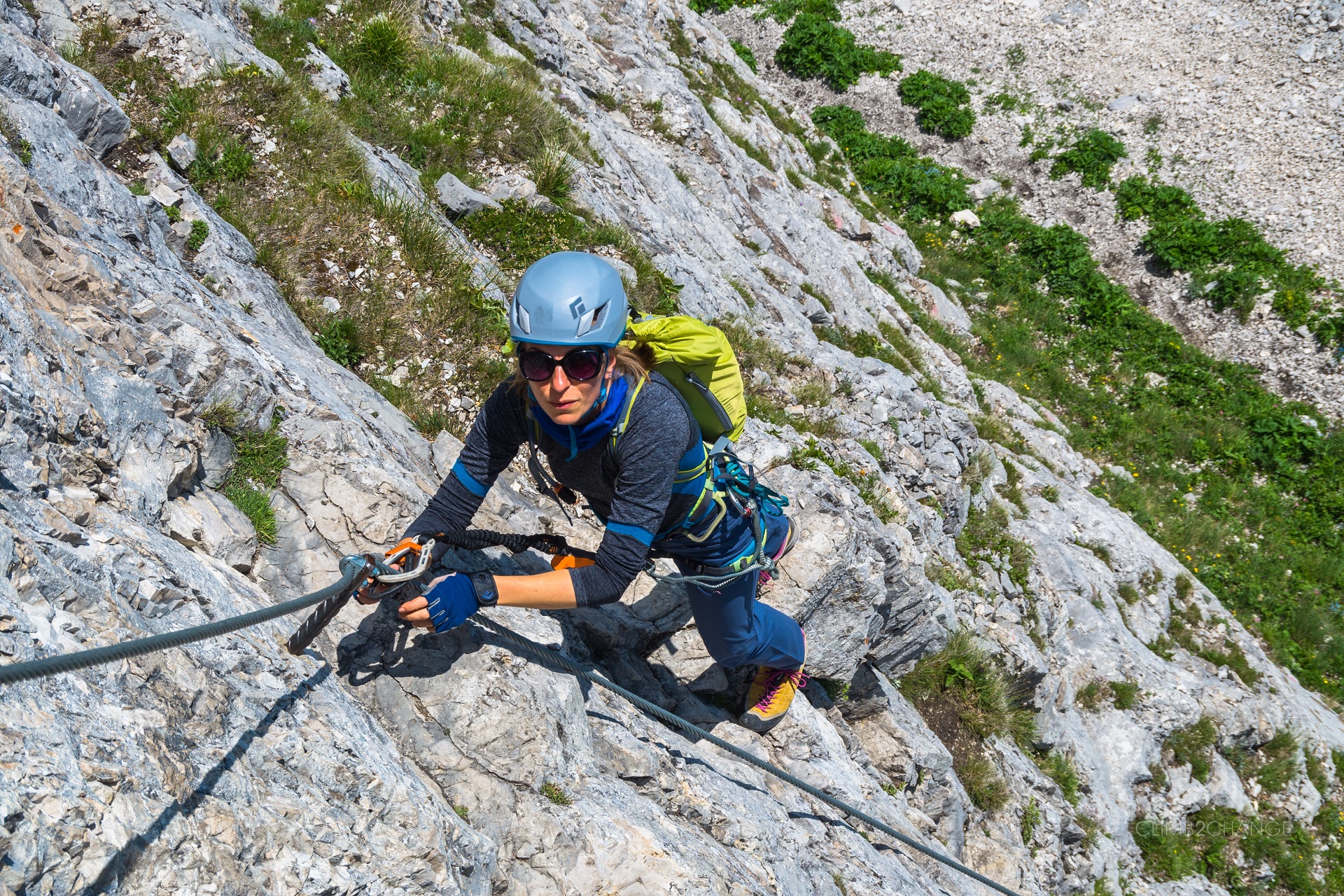 Chwilę po pionowym odcinku przechodzimy w lewo za kant i łatwym, wznoszącym się trawersem w lewo, pokonujemy kolejny odcinek ferraty Sisi.